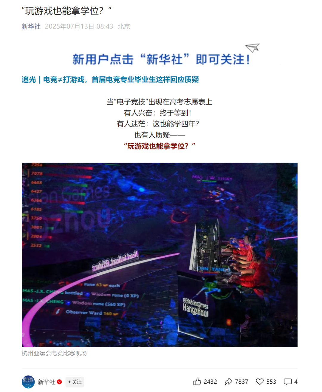 “玩游戏也能拿学位?”是新华社7月最新发布的一篇文章。电竞相关专业在官媒已经不是第一次出现了,关于电子竞技话题,争论与热度也从未停息过。但是,还是有很多人对电子竞技有所误解,贴上"不务正业"的标签,电子竞技不等于游戏,尽管电竞已纳入亚运会项目,但公众认知仍存在偏差,部分家长将电竞专业视为"逃避学习的借口"。