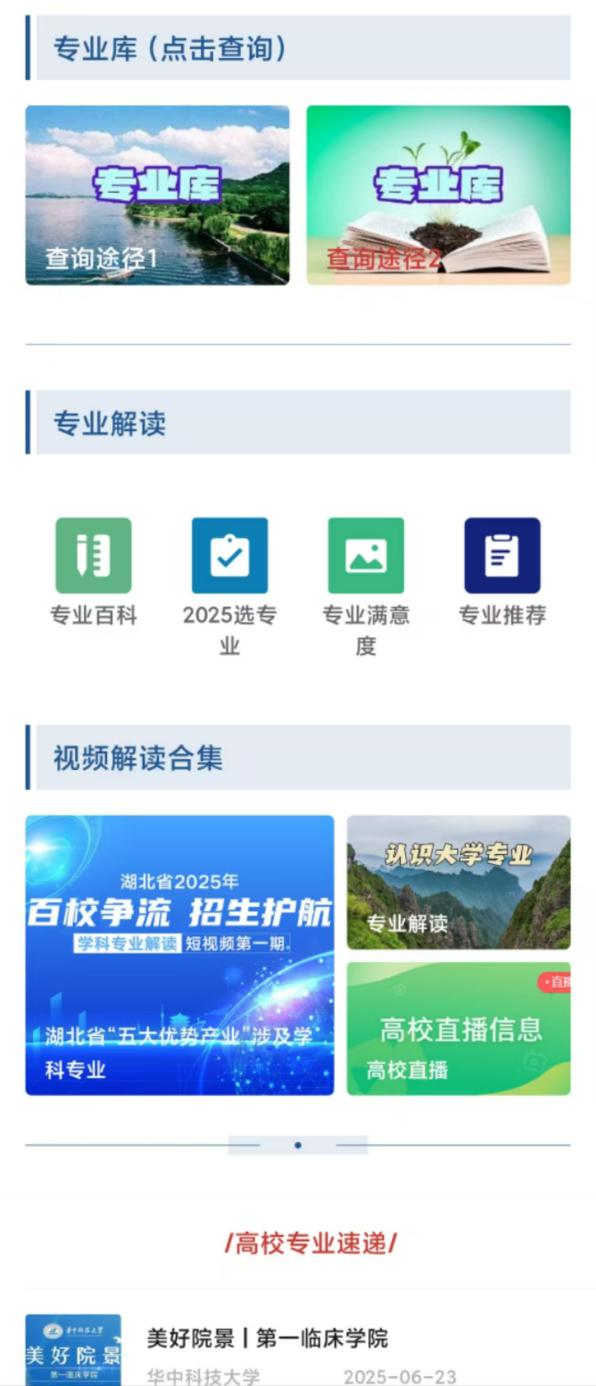 5. “查专业”模块:分为4个功能区域。“专业库”部分提供2个不同查询通道,考生可查询教育部2024年审批备案的专业和2025年本科专业目录。“专业解读”部分提供“专业百科”“2025选专业”“专业满意度”和“专业推荐”等子专题。“视频解读合集”部分提供省招办“百校争流·招生护航”活动征集的湖北“五大优势产业”涉及全省高校的学科专业视频、教育部“认识大学专业”视频和高校直播视频。“高校专业速递”部分提供专业招生最新信息。
