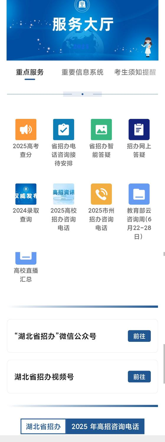 3. “服务大厅”模块:分为“重点服务”、“重要信息系统”、“考生须知提醒”三个子模块,实现“录取查询”、“高考查分”、“网上答疑”、“智能答疑”、官方微信号、视频号、教育部云咨询周、高校直播、考生提醒等信息服务一键直达。录取期间招办咨询电话可一键直拨。