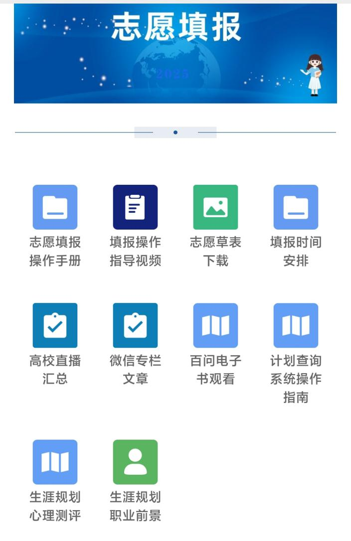 1.“填报志愿辅导”专题:提供志愿填报操作手册、填报指导视频、草表下载、时间安排、计划查询系统操作指南、志愿填报问答电子书、生涯规划心理测评、职业前景等内容一键直达,同时汇集重要的志愿填报信息。