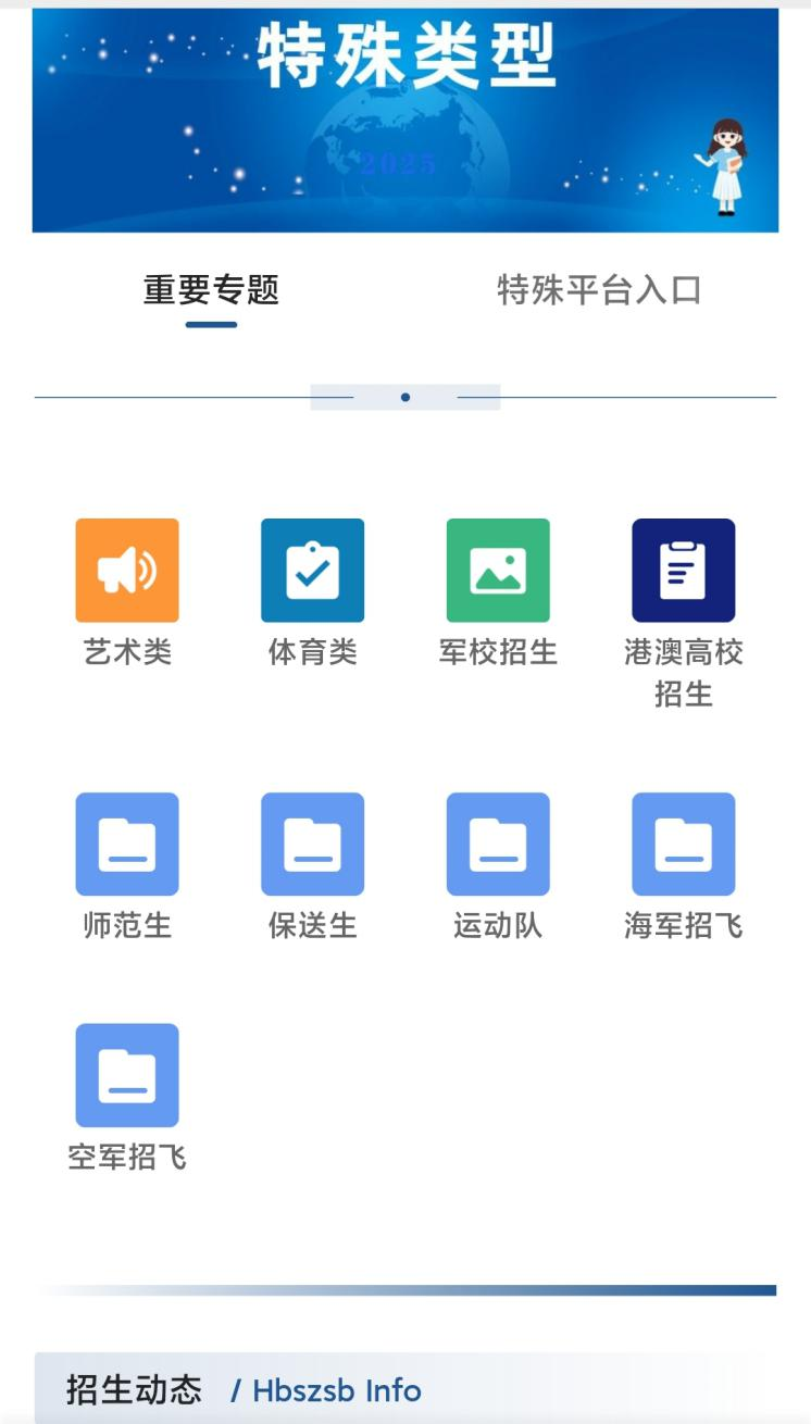 2.“特殊类型招生”专题:提供2025年艺术类、体育类、港澳高校、师范生、保送生、运动队、招飞等9个子专题的政策聚合,同时提供最新招生动态。