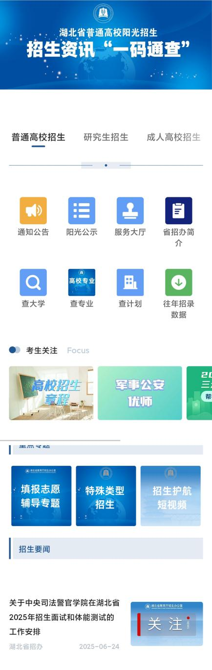 2.总体布局。默认进入“普通高校招生”主页面。首页分为四区,分别为核心功能、考生关注、重点专题、招生要闻。
