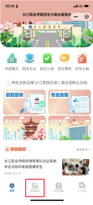 扫描下方二维码进入长江职业学院招生与就业指导处微信小程序,点击【录取动态】,查看《长江职业学院2025年录取进度查询(持续更新)》。