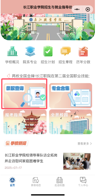 扫描下方二维码进入长江职业学院招生与就业指导处微信小程序,点击【录取查询】栏目