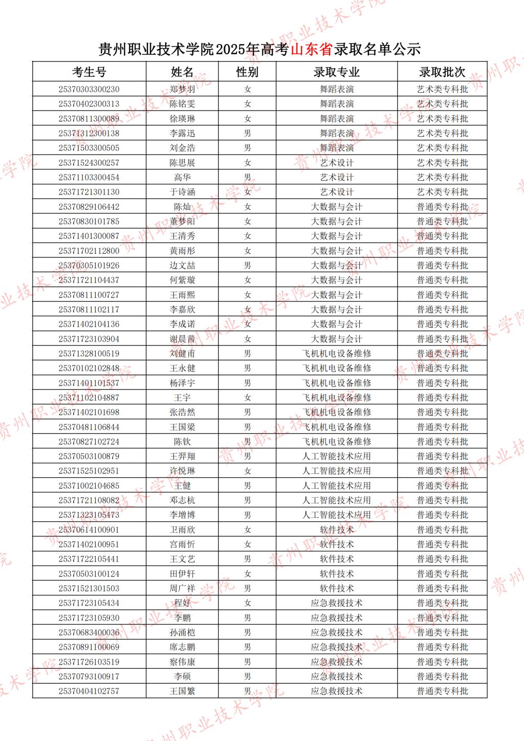 贵州职业技术学院2025年高考山东省录取名单公示