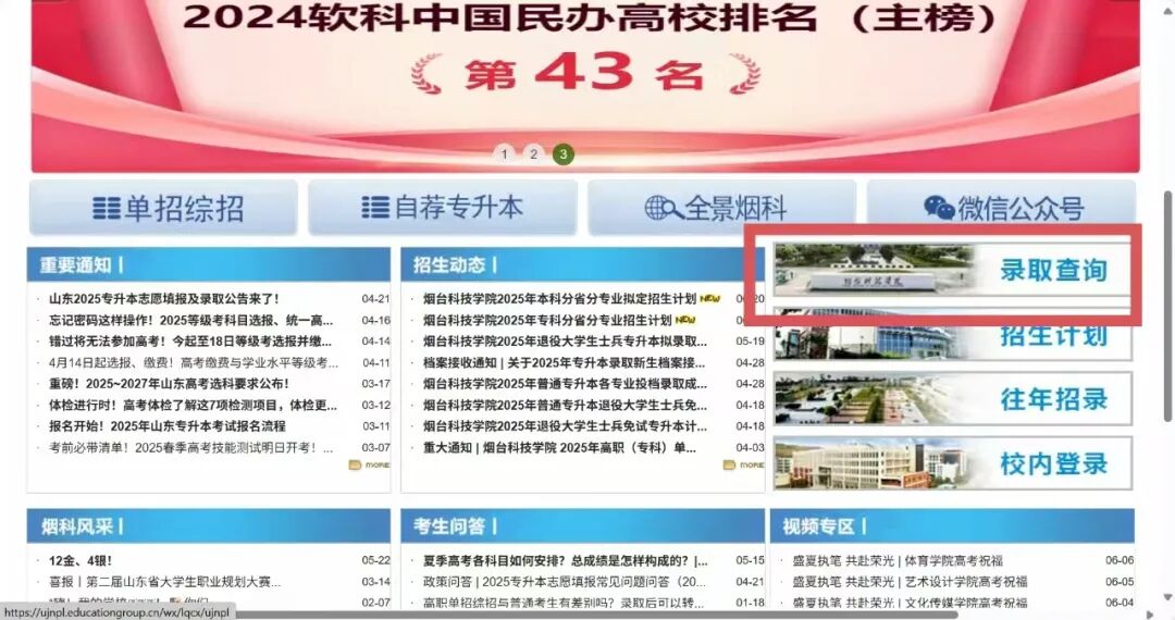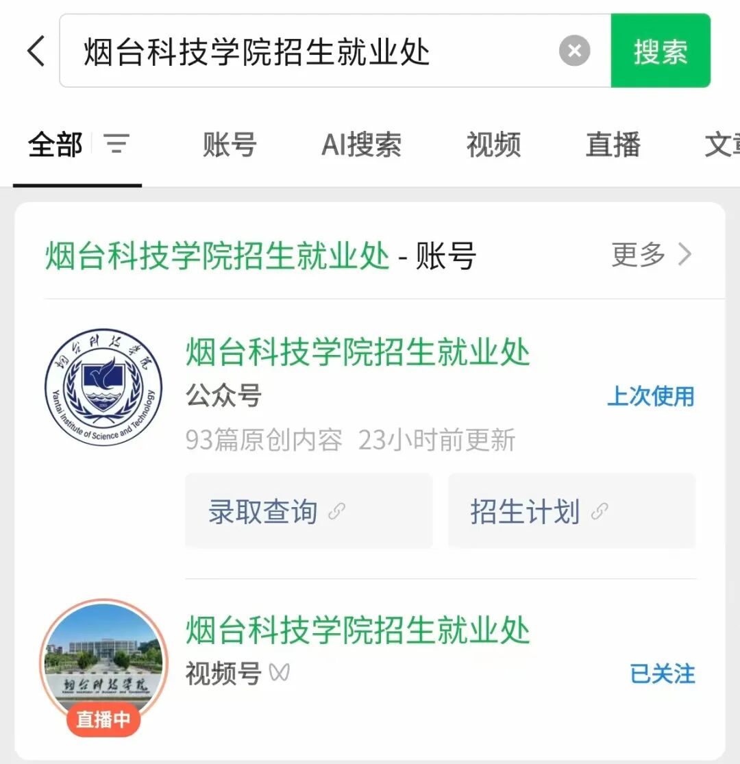 ①关注烟台科技学院招生就业处公众号②点击录取查询,即可进入录取信息查询页面想要了解更多学校的招生信息,请持续关注烟台科技学院官方公众平台