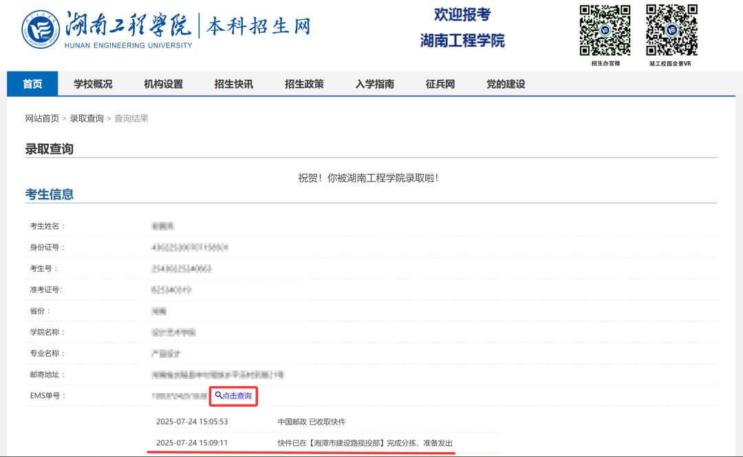 2、通过“EMS单号”后面的点击查询,可以查看录取通知书的物流信息。