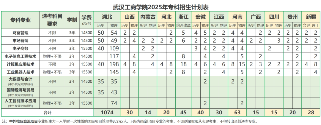 武汉工商学院2025年在12个省(自治区)专科批次有招生计划,具体如下: