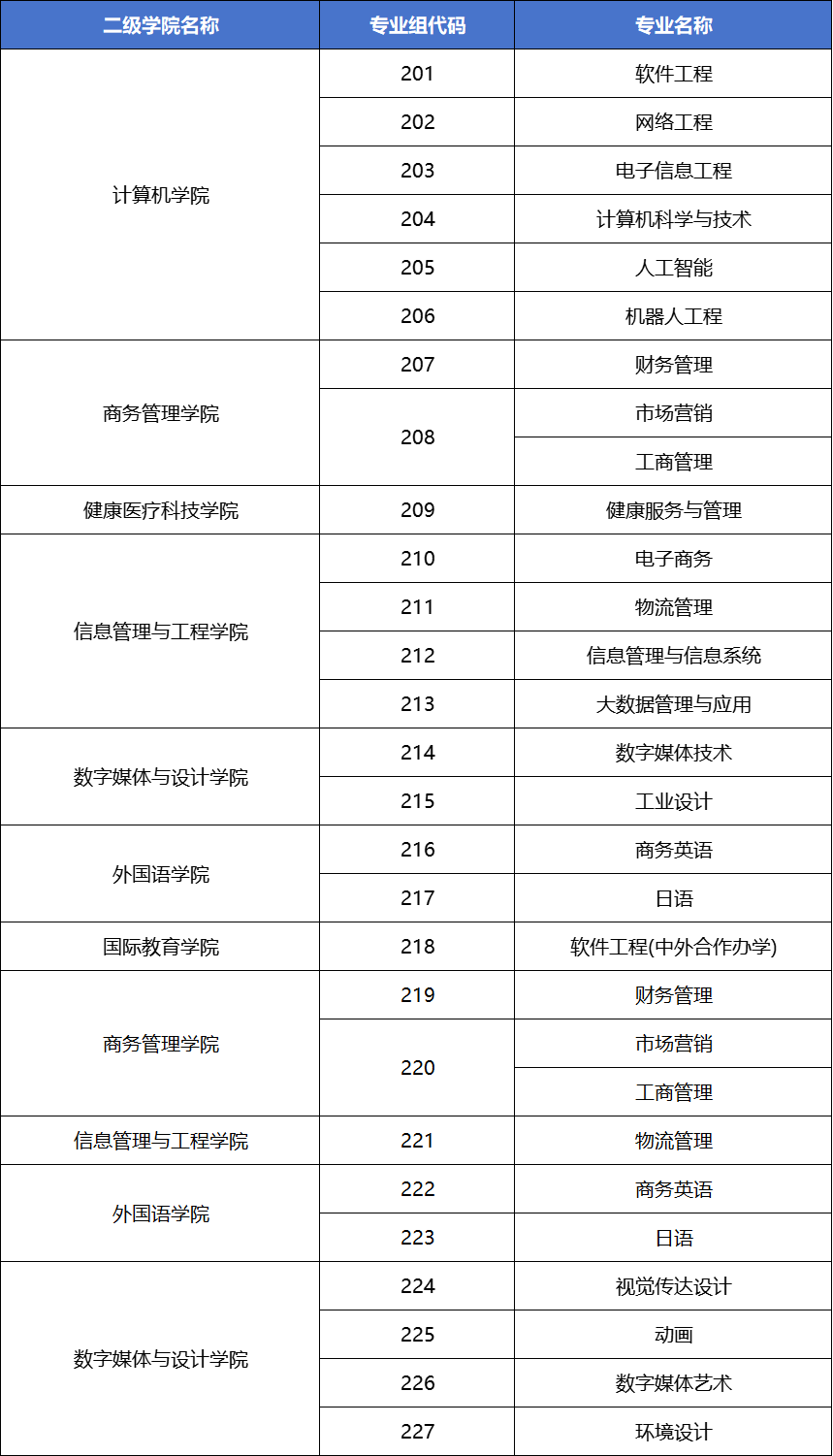 工学学士:数字媒体技术、软件工程、网络工程、电子信息工程、人工智能、计算机科学与技术、机器人工程、工业设计。