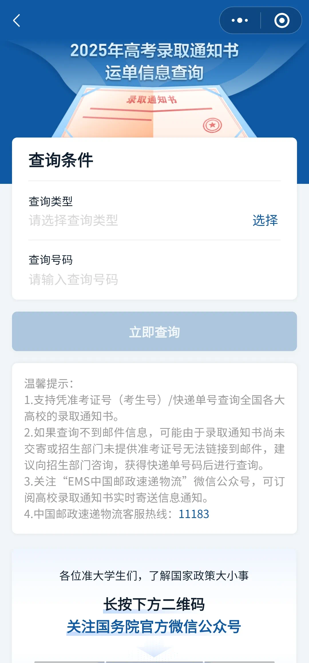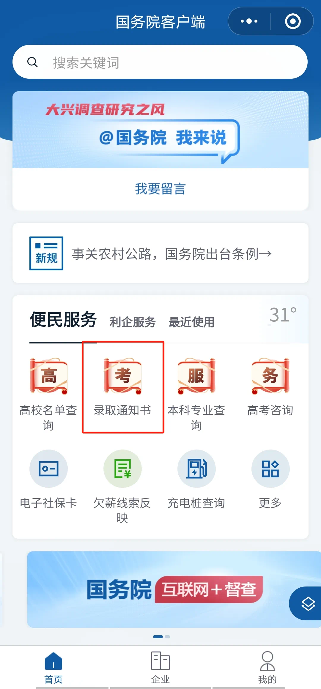 微信搜索“国务院客户端”小程序,点击首页“高考录取通知书”,输入邮件号等进行查询。