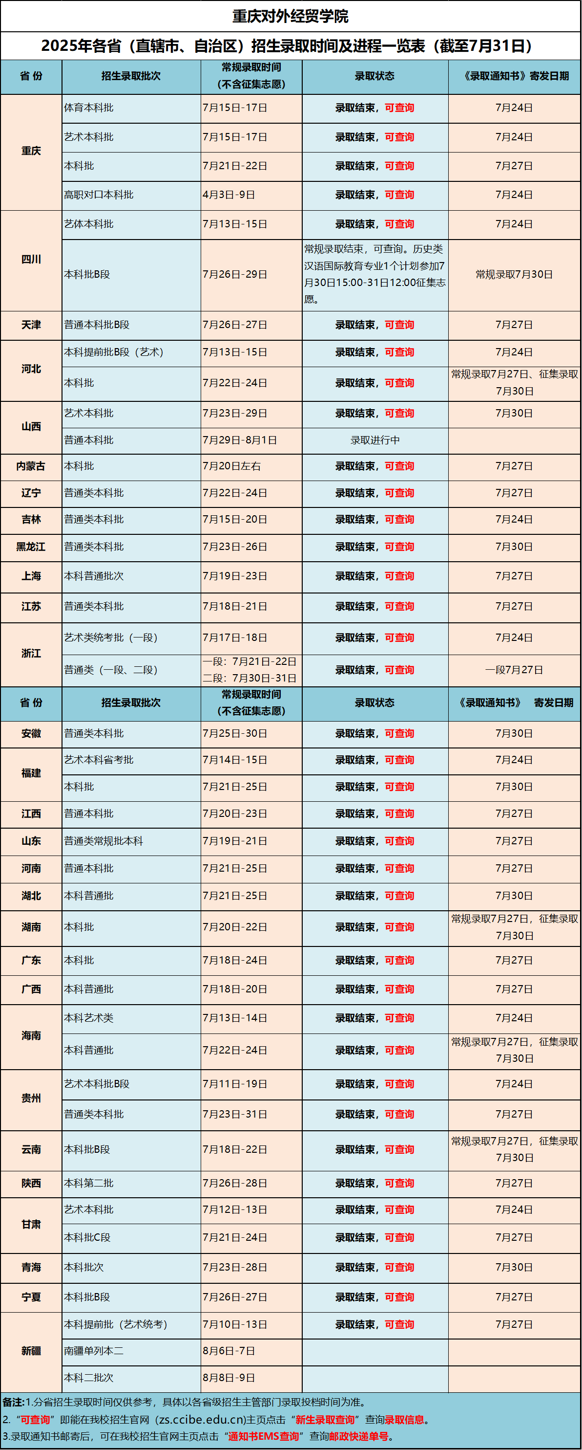 重庆对外经贸学院2025年各省(市、区)录取时间及进程一览表