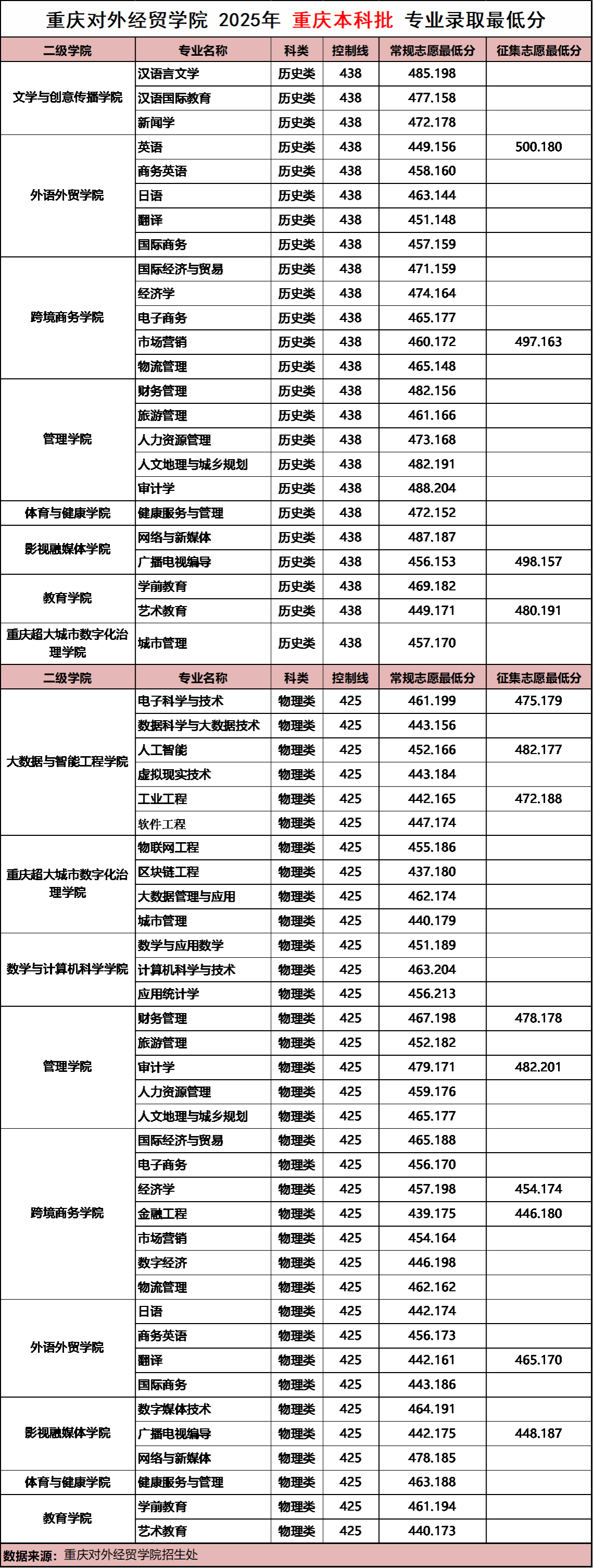 重庆对外经贸学院2025年重庆市本科批录取最低分