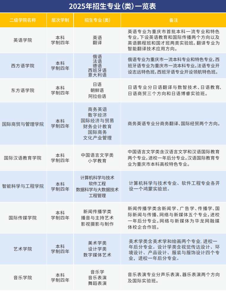 学校占地面积2000余亩,目前在校生24000余人,有渝北和綦江两个校区,校园环境幽美、空气清新、文化氛围浓厚。学校现设有英语学院、西方语学院、东方语学院、国际商贸与管理学院、国际汉语教育学院、智能科学与工程学院、国际传媒学院、艺术学院、音乐学院、博雅国际学院、马克思主义学院、继续教育学院、体育部等13个二级学院(部),开设43个本科专业,涉及文学、教育学、经济学、管理学、艺术学、工学等六大学科门类,面向全国30个省(自治区、直辖市)招生。