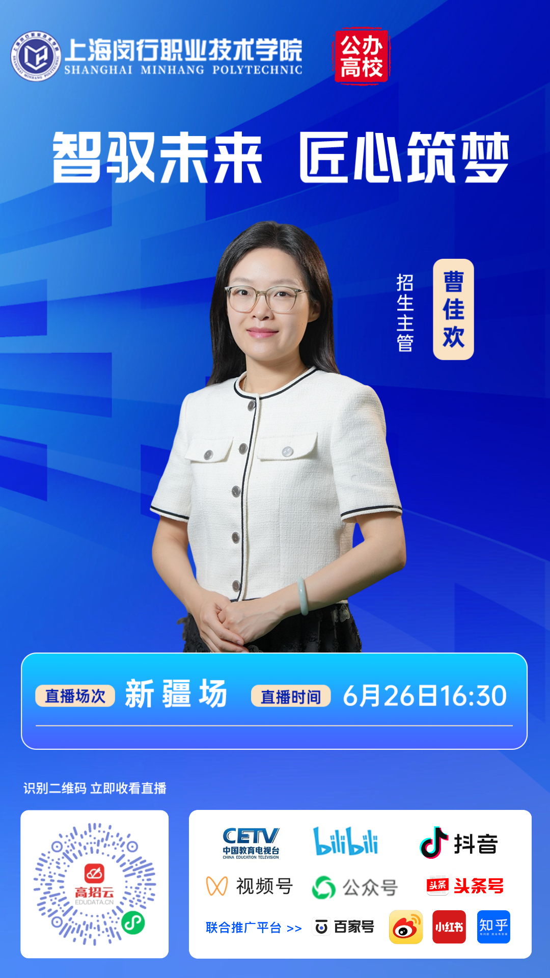 “智驭未来,匠心筑梦”上海闵行职业技术学院秋季高考新疆场招生宣讲支持回放,扫描下方二维码观看,了解学校整体办学情况、办学特色与优势、招生政策与招生专业。
