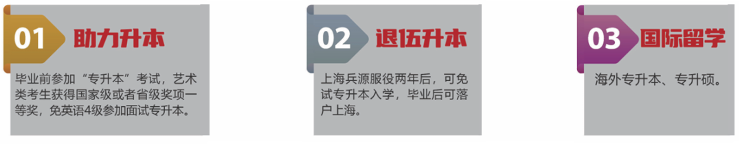 学生可通过上海市“专升本”考试和海外院校“专升本”、“专升硕”等渠道继续学业深造。2025年国内全日制“专升本”有371人成功上岸。主要有华东政法大学、上海对外经贸大学、上海海事大学、上海师范大学、上海政法学院、上海立信会计金融学院、上海健康医学院、上海电力大学、上海第二工业大学、上海工程技术大学、上海商学院、上海中侨职业技术大学、上海杉达学院和上海建桥学院等本科院校接收我校优秀学生。