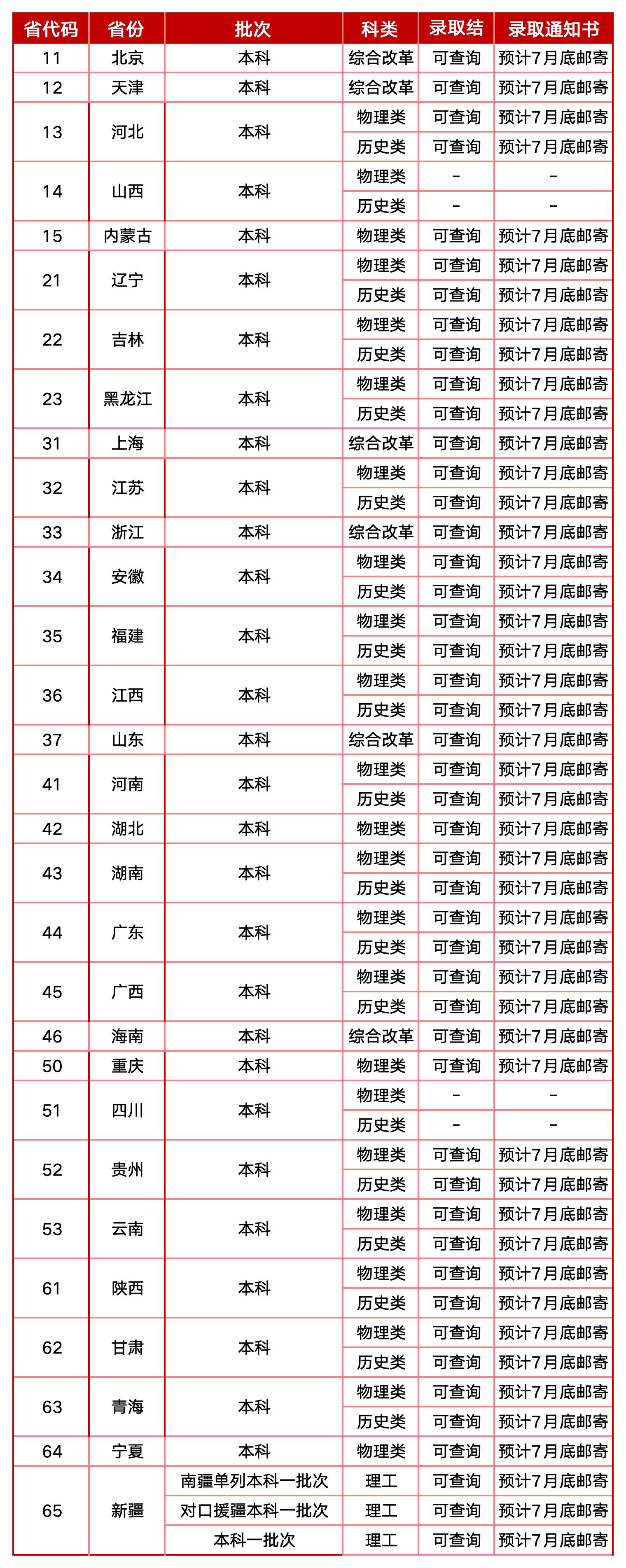 3.对于未公布录取结果的省份(批次),其录取工作将根据各省招生主管部门安排进行,考生们不必心急,请耐心等待。