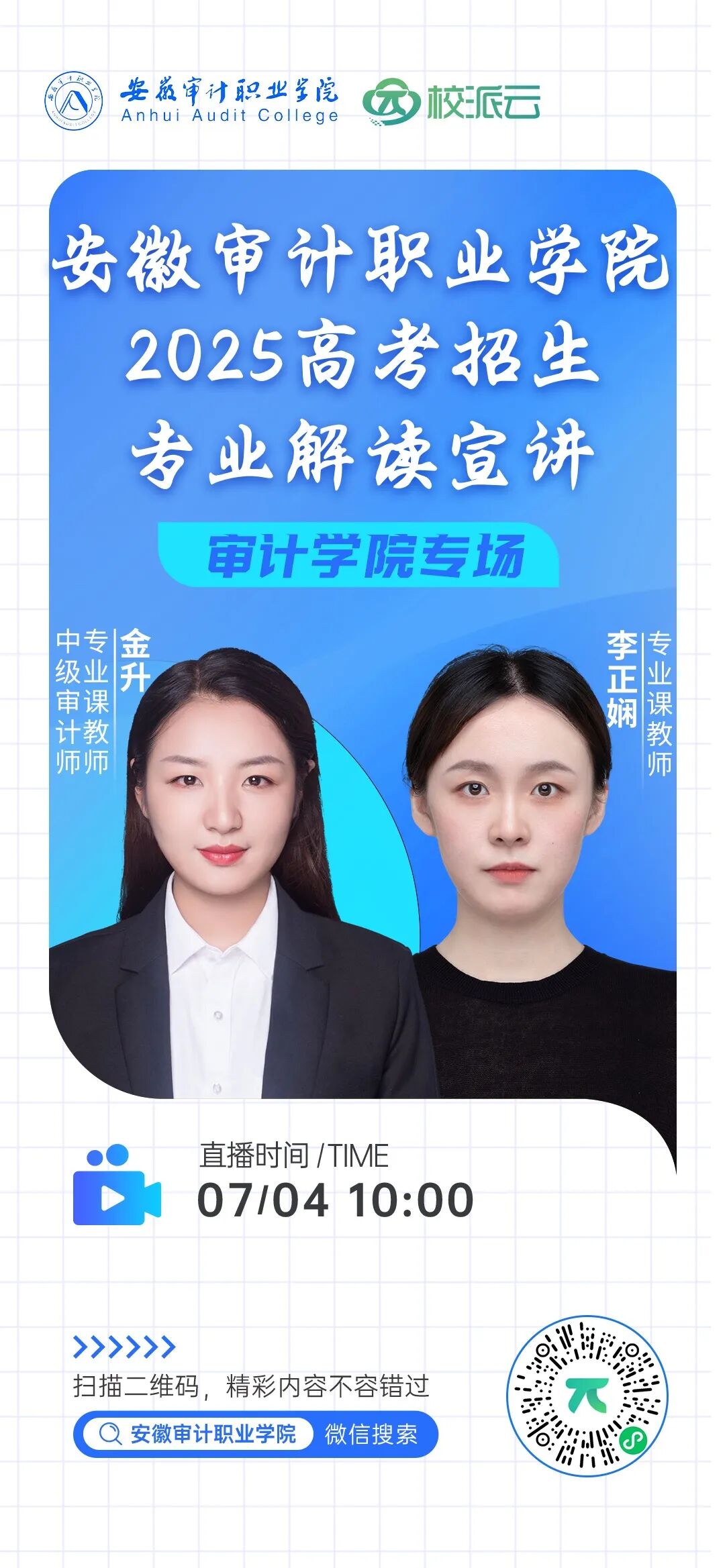 1️⃣ 扫描海报二维码,一键预约直播,不错过任何精彩内容!2️⃣ 微信搜索“安徽审计职业学院”官方公众号,获取更多招生资讯。