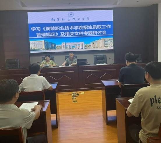 7月4日上午学院招生办公室在学院第三会议室召开学习《铜陵职业技术学院招生录取工作管理规定》及相关文件研讨会,学院招生办公室负责人吴立主持,招生办、教务处、各部门及系部招生相关人员参加。