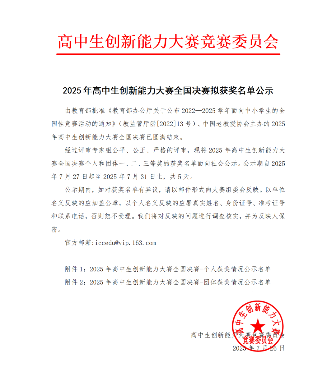 2025年高中生创新能力大赛全国决赛拟获奖名单公示