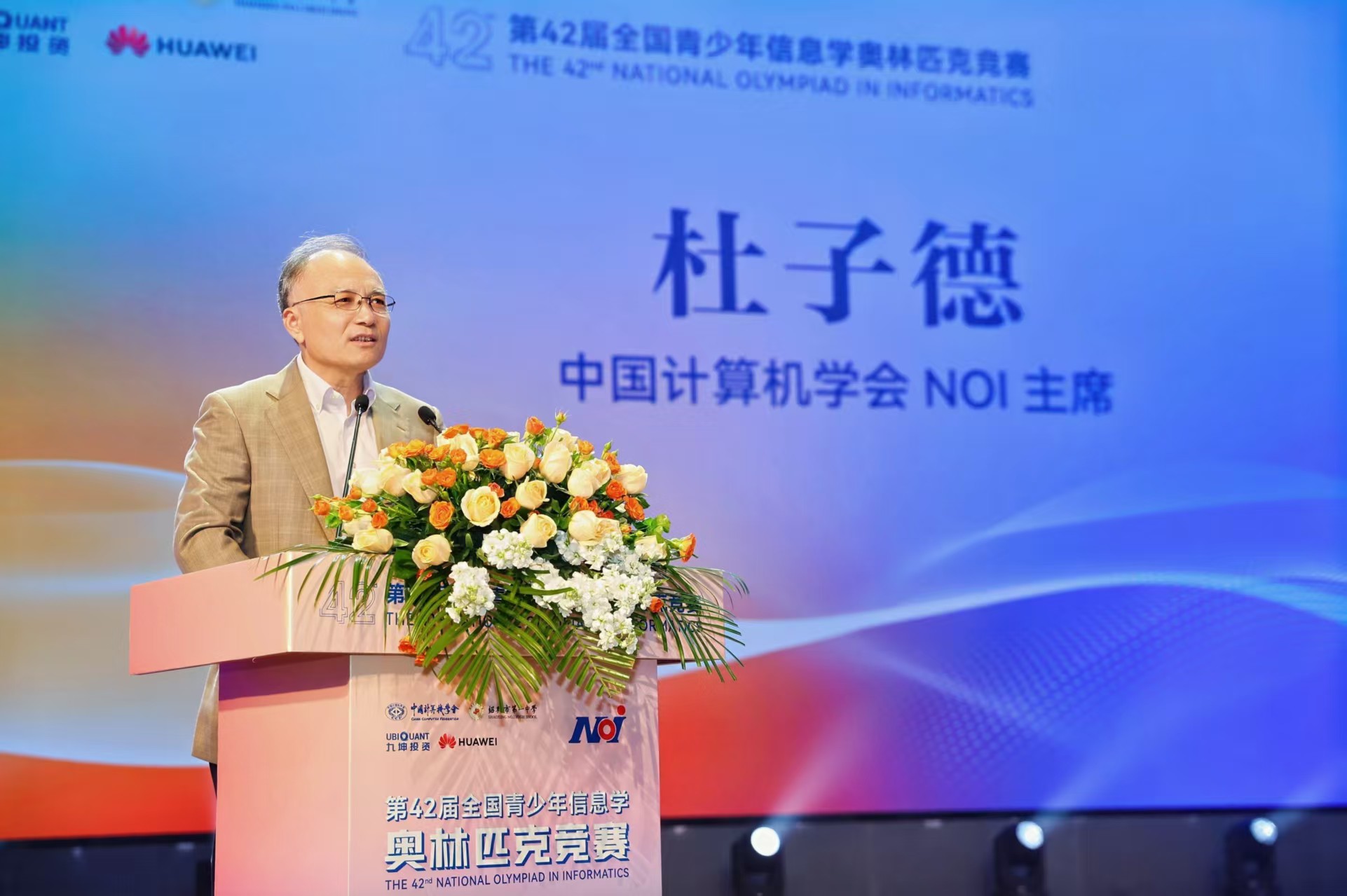 在闭幕式上,杜子德高度评价了本次活动,并代表CCF向NOI2025承办单位绍兴一中教育集团及本次活动的金牌合作单位九坤投资(北京)有限公司、银牌合作单位华为技术有限公司表达感谢。