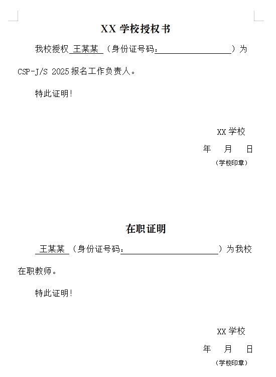 由学校一位负责教师使用完整学籍学校名称进行学校注册,须将该负责教师的学校授权证明(加盖单位公章)和在职证明的JPG照片凭证上传报名系统,格式如下图。