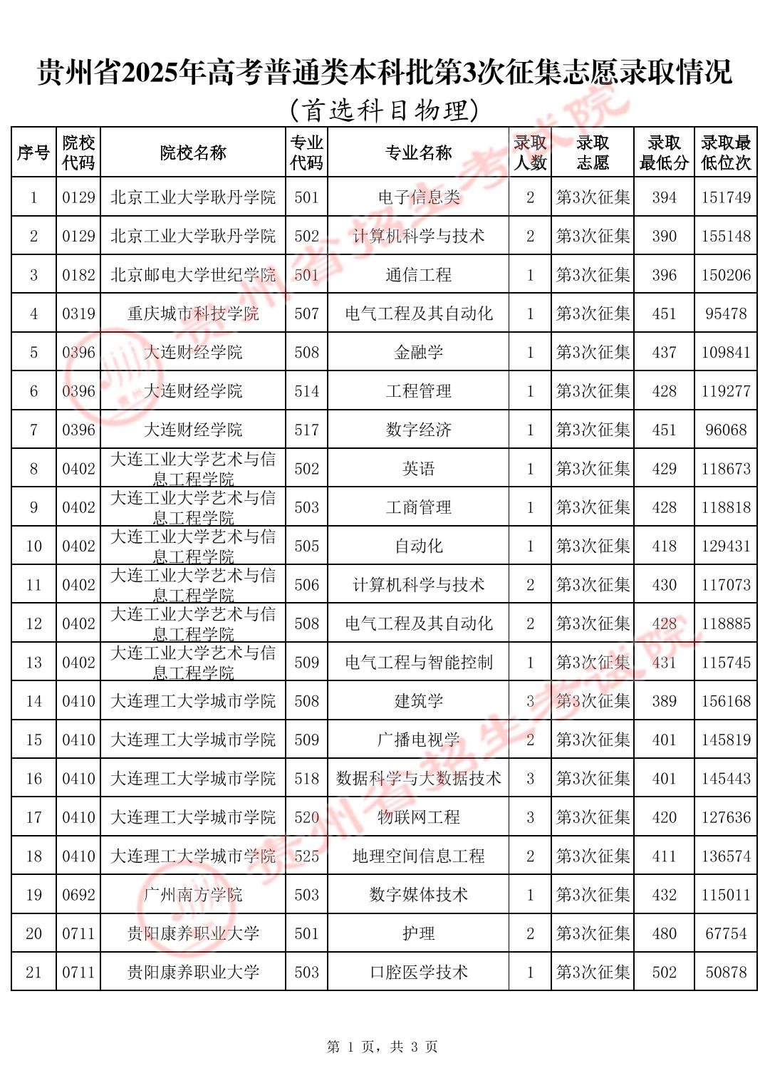 贵州省2025年高考普通类本科批第3次征集志愿录取情况(首选科目物理).pdf