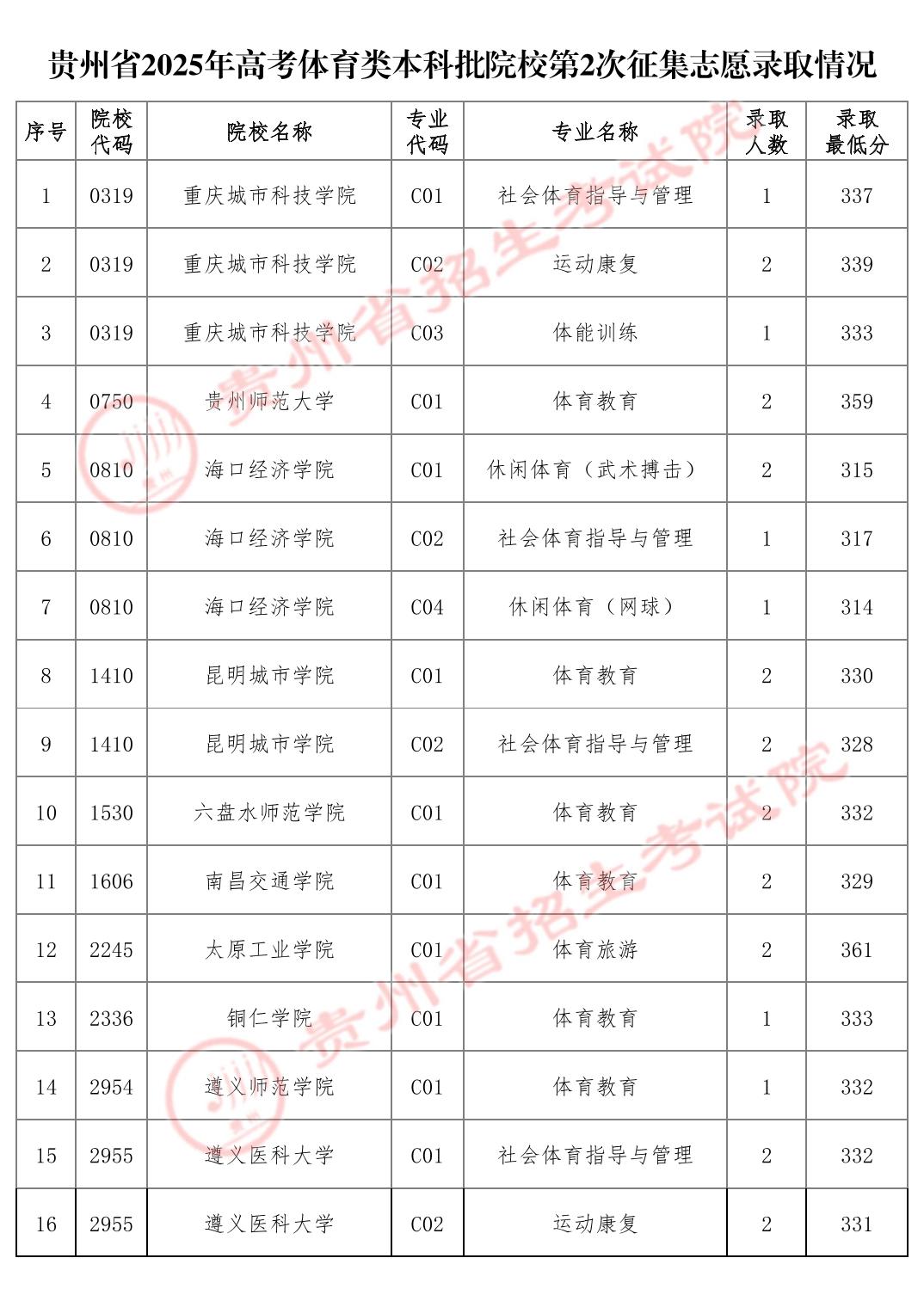 贵州省2025年高考体育类本科批院校第2次征集志愿录取情况.pdf