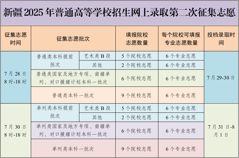 本次征集志愿具体范围及时间安排为:7月28日8时至18时,普通类本科提前批次,普通类国家及地方专项、南疆单列、对口援疆计划本科一批次,普通类本科一批次未完成计划征集志愿,7月29日至30日投档、录取;7月30日8时至18时,单列类本科提前批次,单列类国家及地方专项、南疆单列、对口援疆计划本科一批次,单列类本科一批次未完成计划征集志愿,7月31日至8月1日投档、录取。