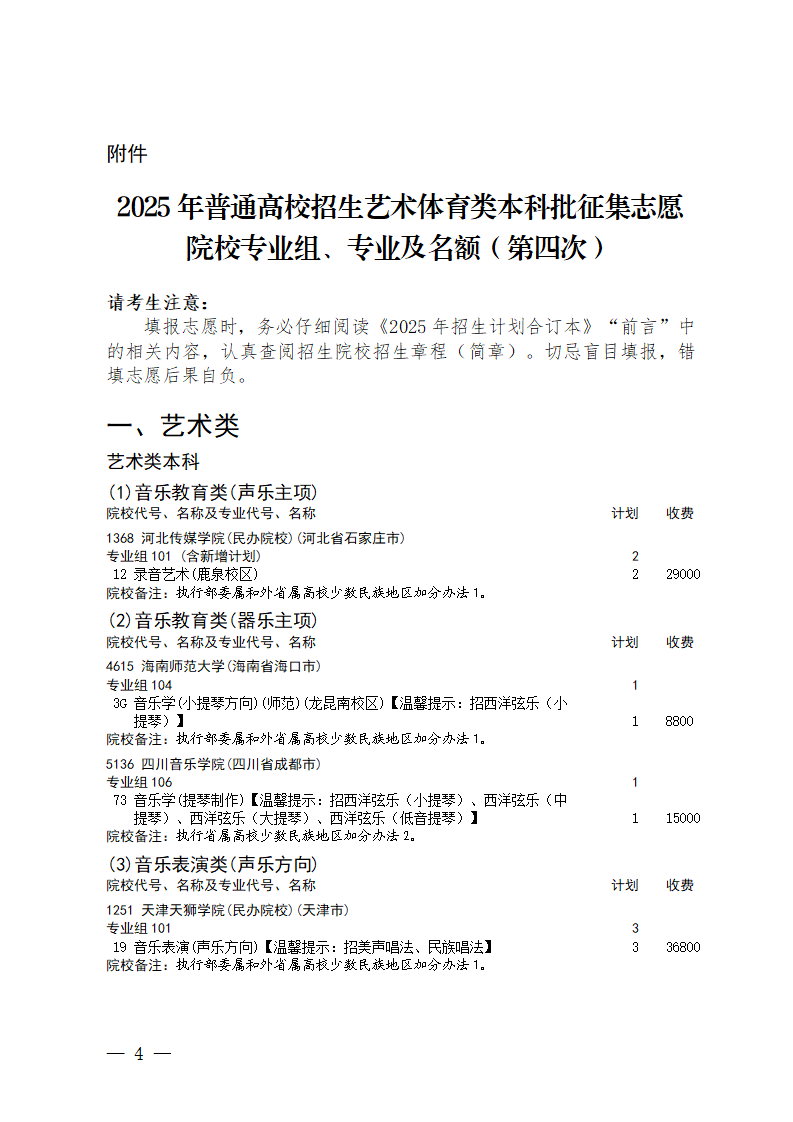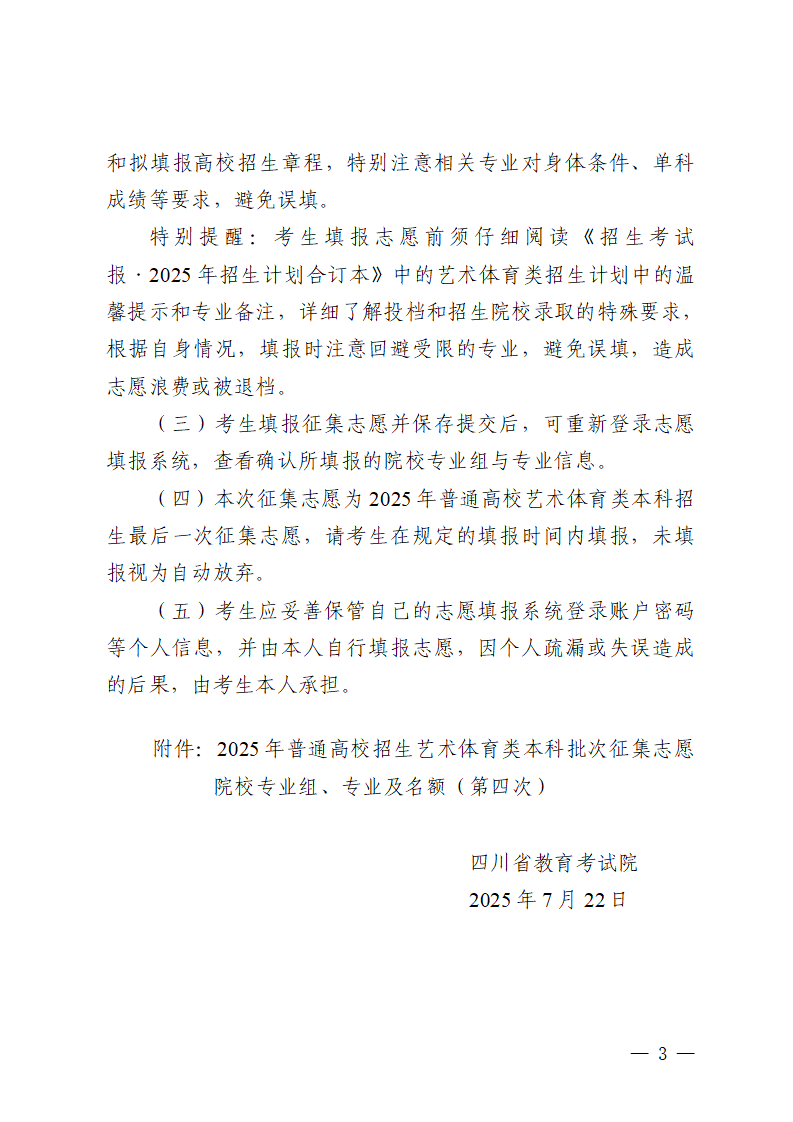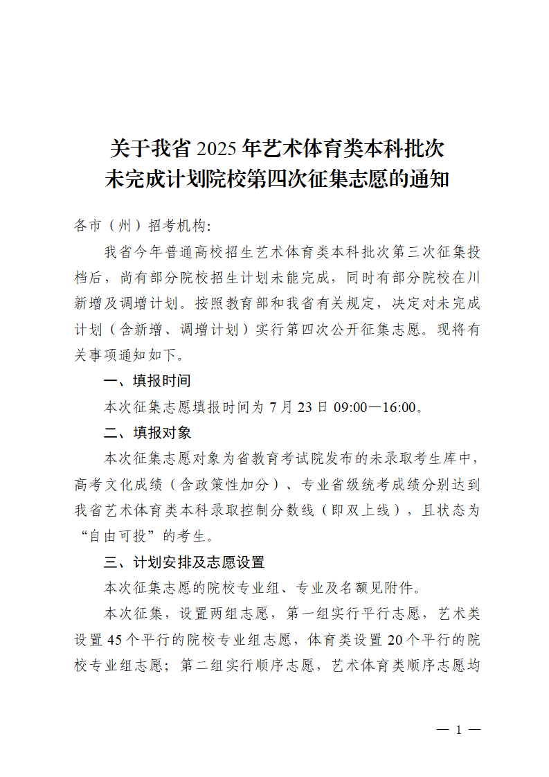 关于我省2025年艺术体育类本科批次未完成计划院校第四次征集志愿的通知