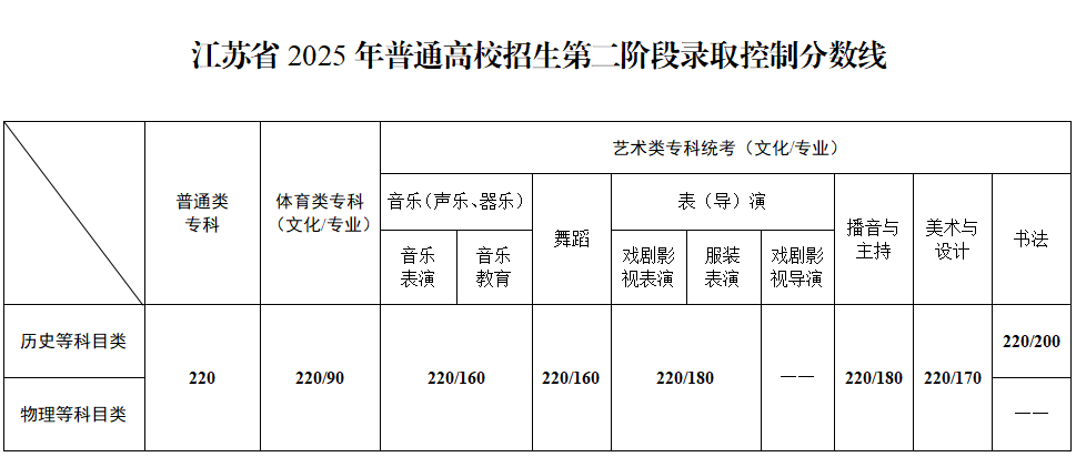 江苏省2025年普通高校招生第二阶段录取控制分数线