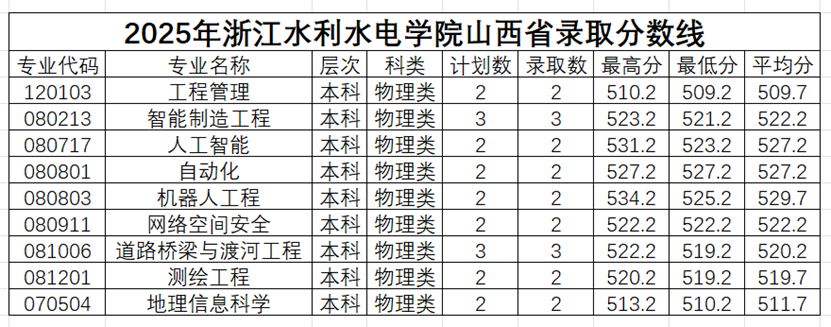 2025年浙江水利水电学院山西省普通类录取顺利结束,所有考生都在特控线以上录取。请考生以身份证号码登录我校本科招生网查询录取结果。物理类专业最低分为509.2分。录取情况详见下表。