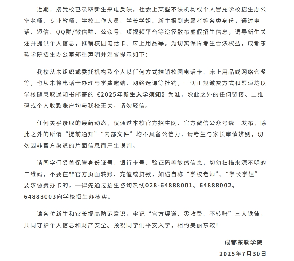 成都东软学院 | 关于防范招生诈骗的严正声明