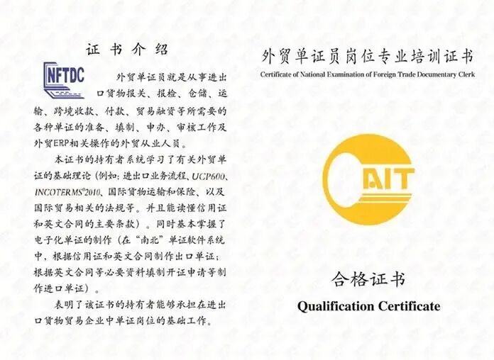 跨境电商 B2B 数据运营职业技能等级证书、国际商务单证员。