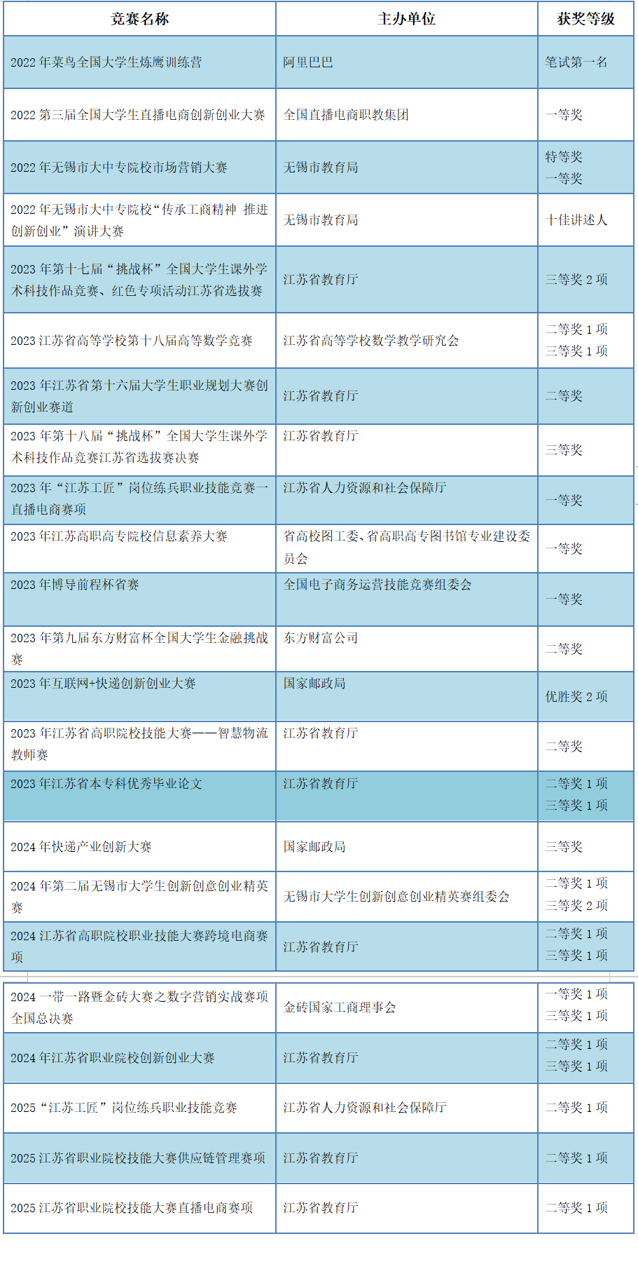 近三年指导学生参加省级以上技能比赛,获得特等奖3项、一等奖9项、二等奖17项。与苏州顺丰速运有限公司、湖南茶悦文化产业发展集团有限公司、中国邮政速递物流股份有限公司无锡市分公司、京东乾石科技有限公司、浙江驿栈网络科技有限公司(菜鸟)、宜家(中国)投资有限公司无锡分公司、江苏红豆对外贸易有限公司等多家知名企业深度合作,开设“顺丰雏鹰班”“茶颜悦色学徒班”“菜鸟店长班”“宜家电子商务创新班”“典亮跨境电商创新班”等,探索“订单班”、“现代学徒制班”等人才共育模式。