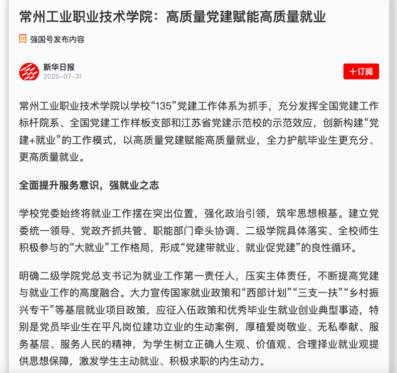 学习强国:常州工业职业技术学院:高质量党建赋能高质量就业