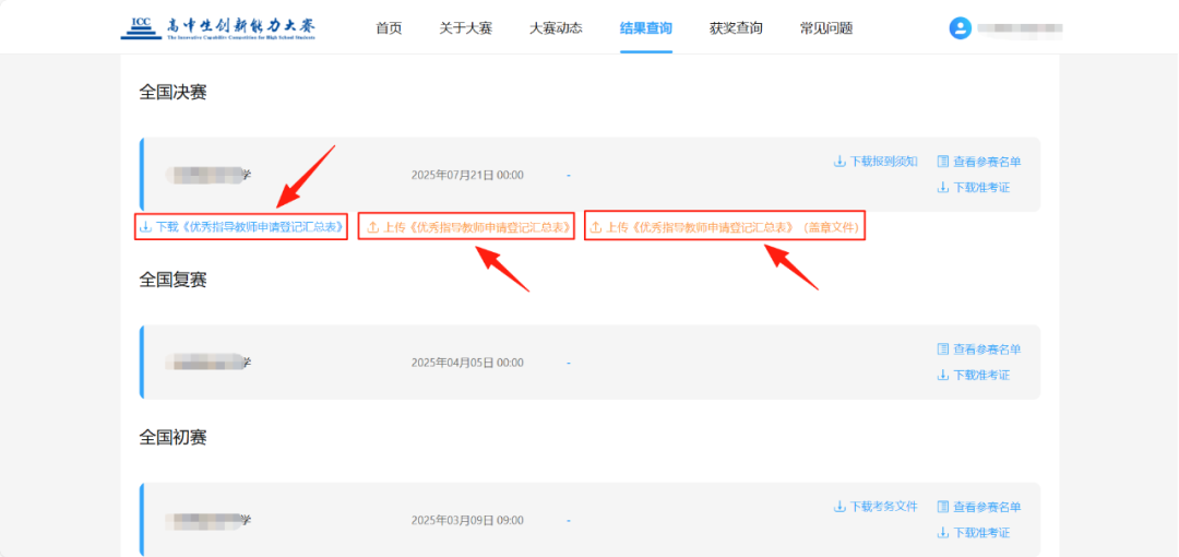 各参赛学校:2025年高中生创新能力大赛“国家级优秀指导教师”已开始申请,现将有关事项通知如下:一、申请要求请各校以单位名义,统一为指导学生获得全国奖项的教师提交申请材料。二、申请时间截止到2025年9月1日,逾期不再受理。三、申请流程各参赛学校负责老师下载附件“优秀指导教师申请登记汇总表.xlsx”并填写相关信息后,分别将填写完成的“优秀指导教师申请登记汇总表.xlsx”及加盖学校公章的“优秀指导教师申请登记汇总表.pdf”上传至大赛官网,具体操作如下: