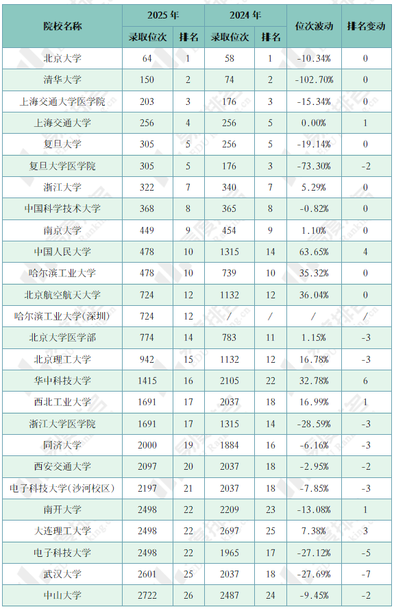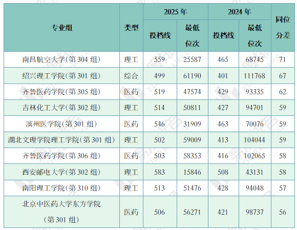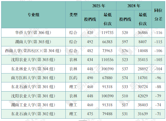 注:1.2024年同位分=2024年投档位次在2025年一分一段表中所对应的分数;2.仅含两年均招生的专业组
