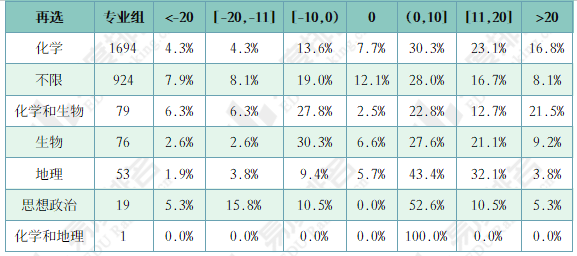 下表展示了山西院校-专业组各选科的同位分差分布情况,再选科目要求位