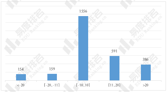 下图展示了山西2025年物理类普通本科批院校-专业组投档最低分与上一年度同位分差值的直方图,差值为负代表院校-专业组2025年的投档位次有所下降,反之则代表院校-专业组的投档位次有所上升。