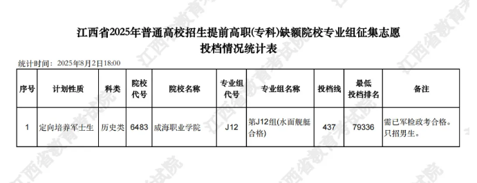 权威发布!江西省2025年普通高校招生提前高职(专科)缺额院校专业组征集志愿投档情况统计表