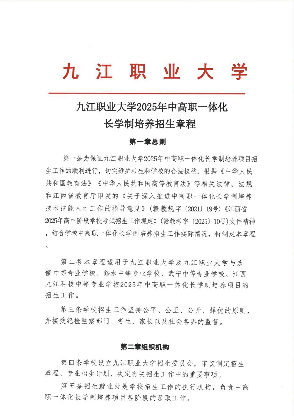九江职业大学2025年中高职一体化长学制培养招生章程