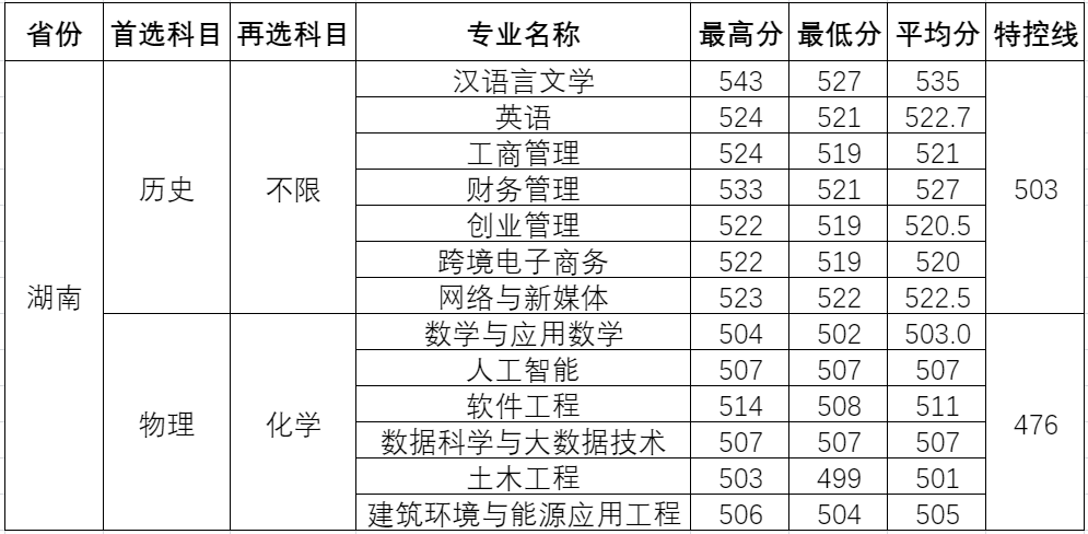 我校在湖南省普通本科批历史类录取最高分543,投档分519;物理类「物理+化学」专业组录取最高分514,投档分499。湖南省新生全员特控线上!