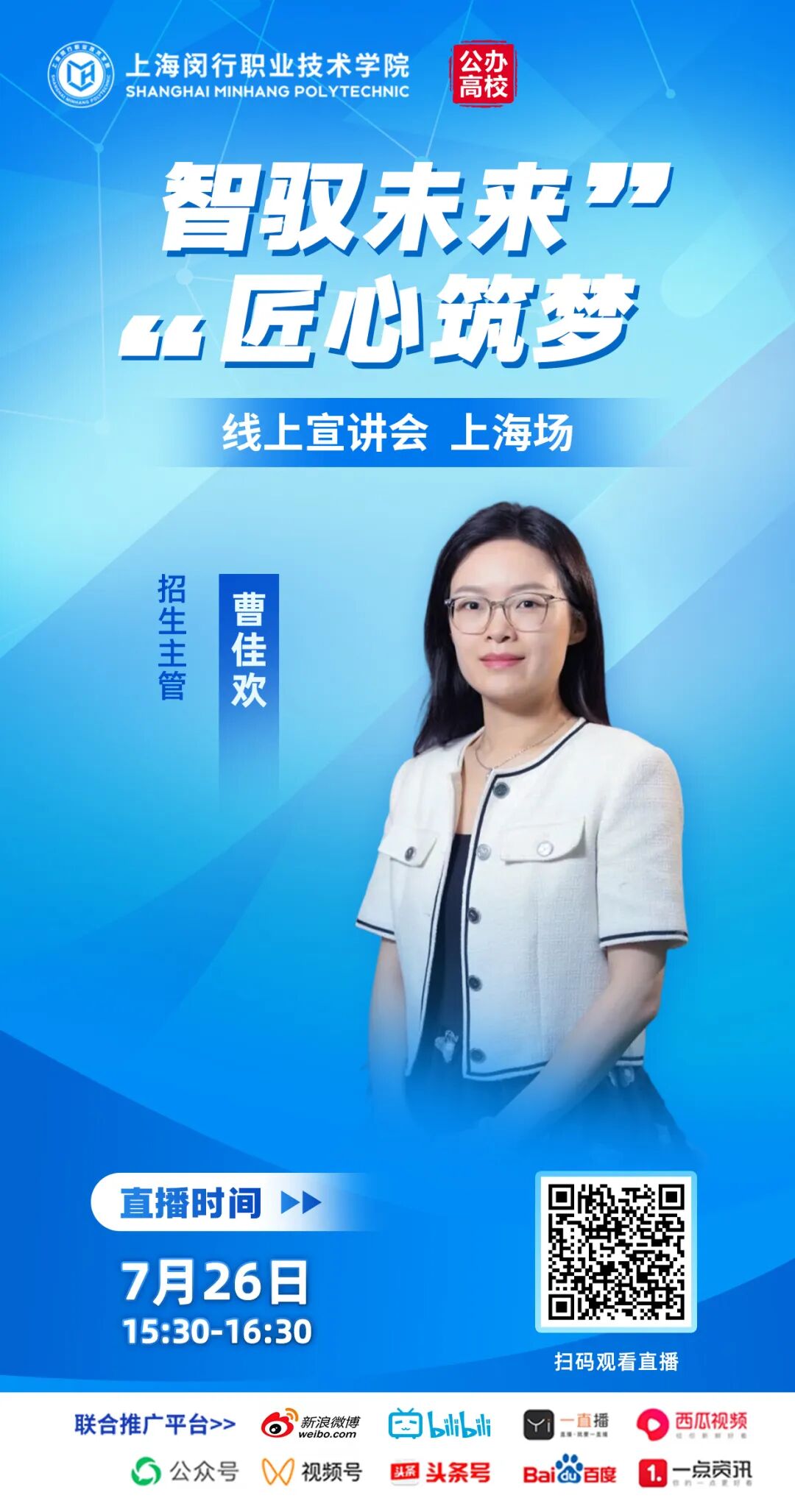 “智驭未来,匠心筑梦”上海闵行职业技术学院上海高招线上宣讲会将于7月26日周六下午15:30准时开播,扫描下方二维码预约,了解学校整体办学情况、办学特色与优势、招生政策与招生专业。