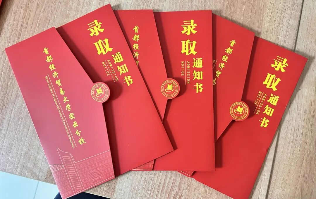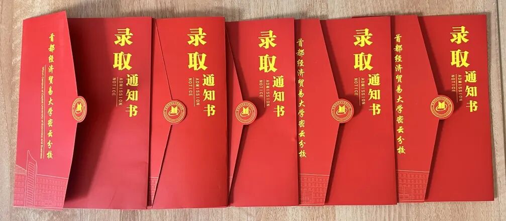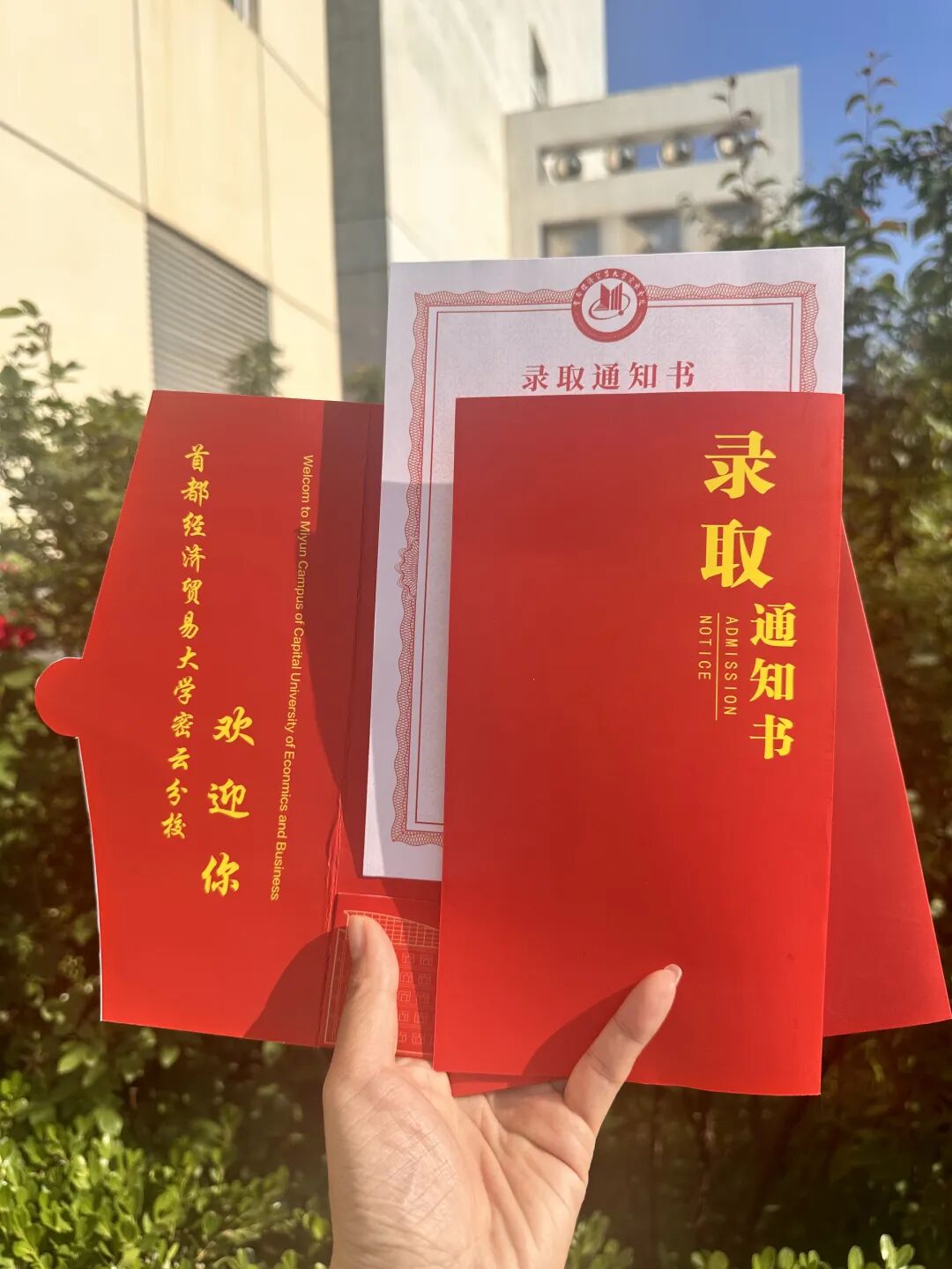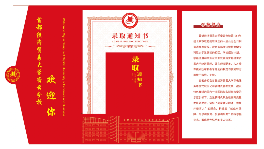 新版录取通知书由外壳和内页两部分组成。外壳设计简约大气,以中国红为底色,封面的字体与LOGO采用金色,表现了首经贸密云分校学子的朝气蓬勃。通知书背面,“崇德尊师 笃学强技”的校训映入眼帘,白色线条勾勒出主教学楼轮廓。