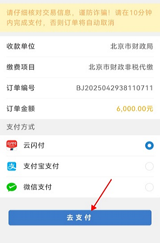 (3) 选择支付方式(云闪付、微信支付、支付宝),点击去支付。