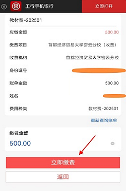 (1)教材费须用北京市内开户的工商银行的本人或亲友银行卡支付(支付宝或微信支付均可,银行卡绑定的是工商银行卡,输入学生身份证即可)。