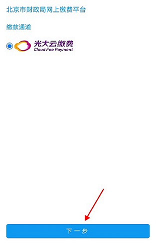 (2) 点开链接会出现学校信息、应缴费学生姓名、金额,点击下方蓝色缴费按钮进入缴款通道--光大云缴费,点击下一步。
