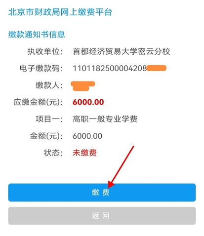 (4) 点击支付,即跳转到您选择的缴费方式界面,输入支付密码即可完成缴费。