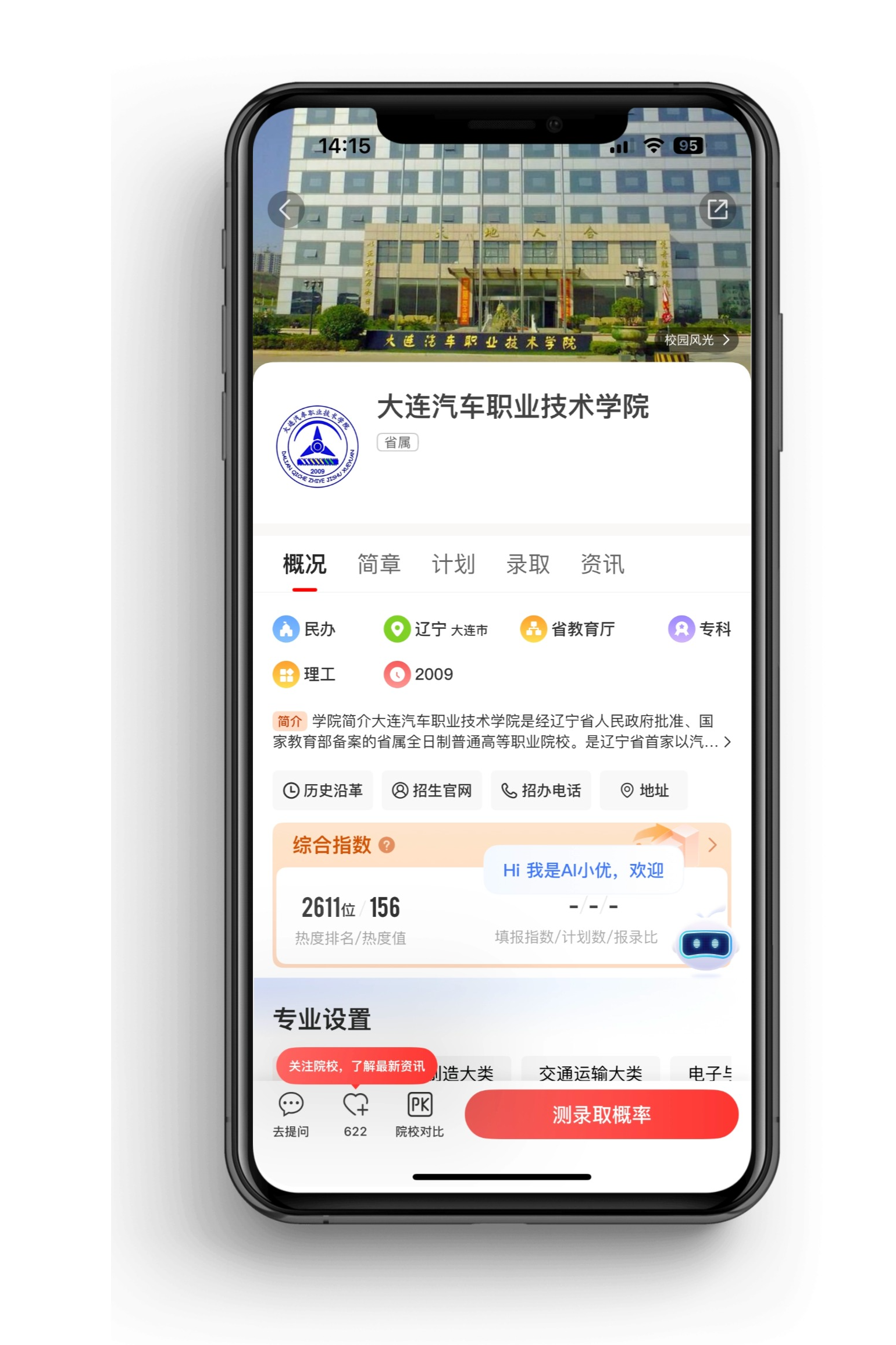 如果你对汽车技术、影视动画或其他专业充满热情,渴望在大连这座充满活力的城市实现职业梦想,那么大连汽车职业技术学院无疑是你的不二之选。选择专业和院校时,优志愿APP能助你一臂之力。你可以深入了解大连汽车职业技术学院的专业详情、录取数据等信息,让每一份努力都精准对接未来方向,让职业梦想在科学规划中照进现实。