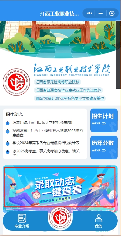 为了让报考学校的考生更加方便快捷地查询到自己的录取信息,学校全面开通“江西工业职业技术学院招就处”微信小程序录取查询功能。各省(自治区、直辖市)的录取结果通常在正式投档2-3个工作日之后,可在学校招生信息网或江西工业职业技术学院招就处微信小程序上查询录取结果;亦可以正式投档5-7个工作日之后,在各省(自治区、直辖市)级考试机构指定的网站查询录取结果,请确保您输入的考生号和姓名与报名时填写的信息完全一致,以免查询失败。